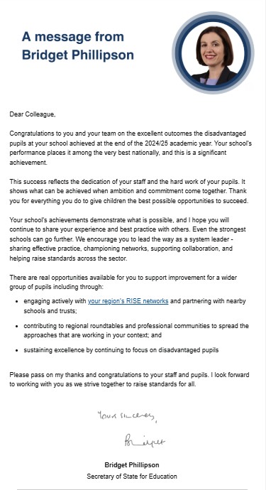 Halley House School, Kilburn Grange School, and Whiteknights Primary School have each received a letter of congratulations from Bridget Phillipson, Secretary of State for Education, recognising their exceptional outcomes for disadvantaged pupils in the 2024/25 academic year. The letter was sent to the top 25 per cent nationally, based on outcomes for poorer pupils.