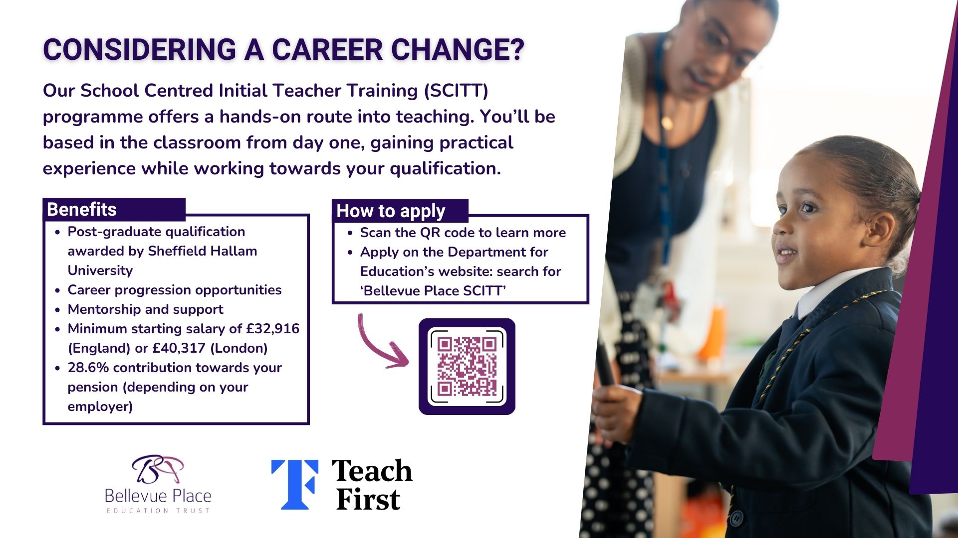 - Apply on the Department for Education’s website (you’ll need to create a login): search for Bellevue Place SCITT.
