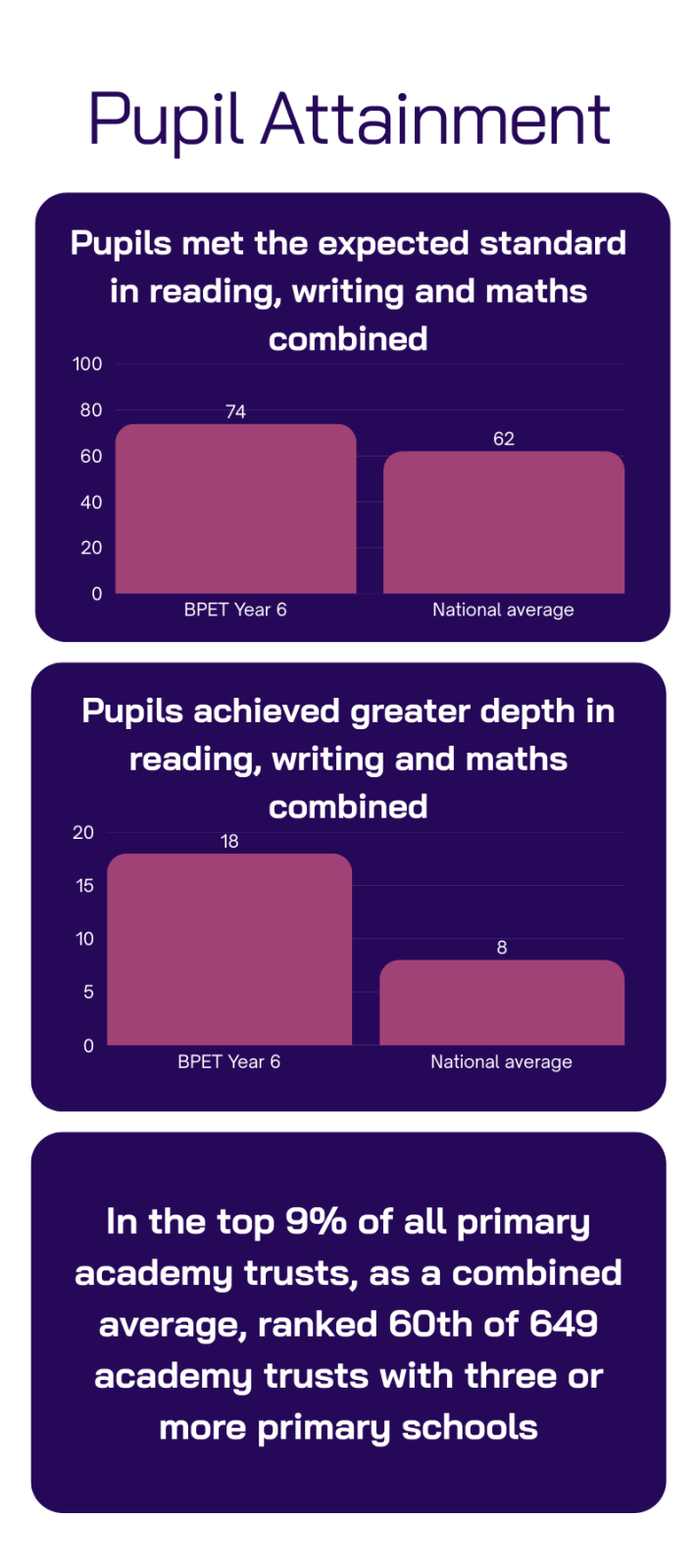 - Pupil attendance to be above 96% and persistent absence below 10% in every BPET school